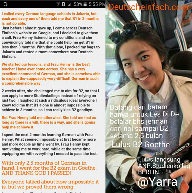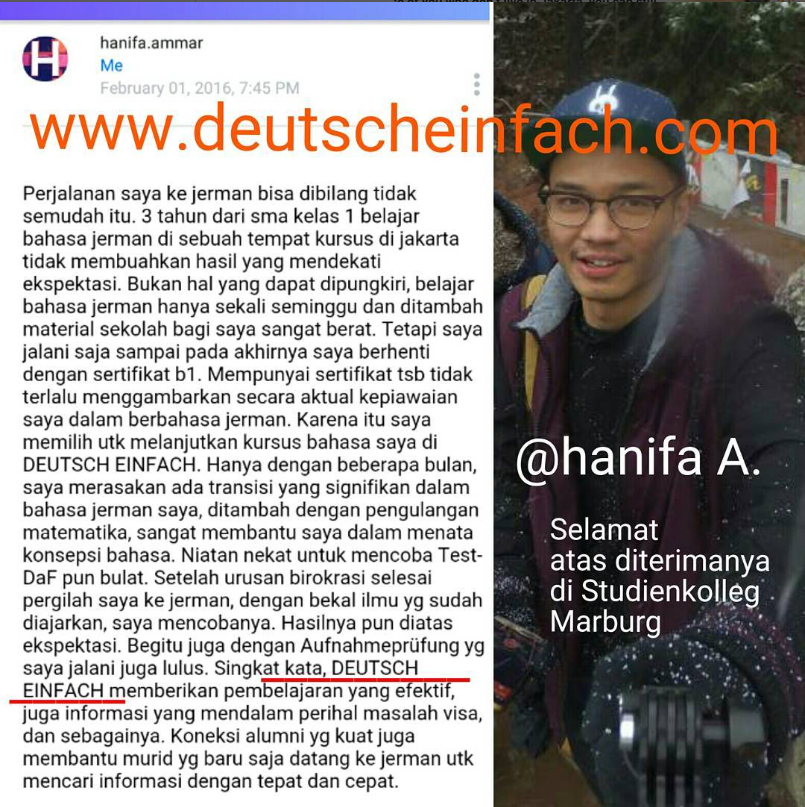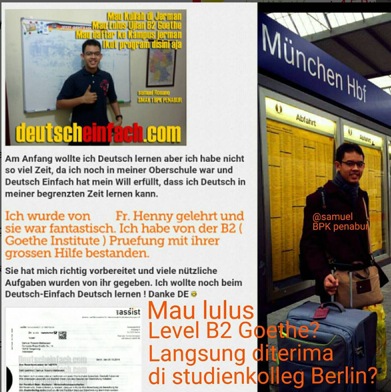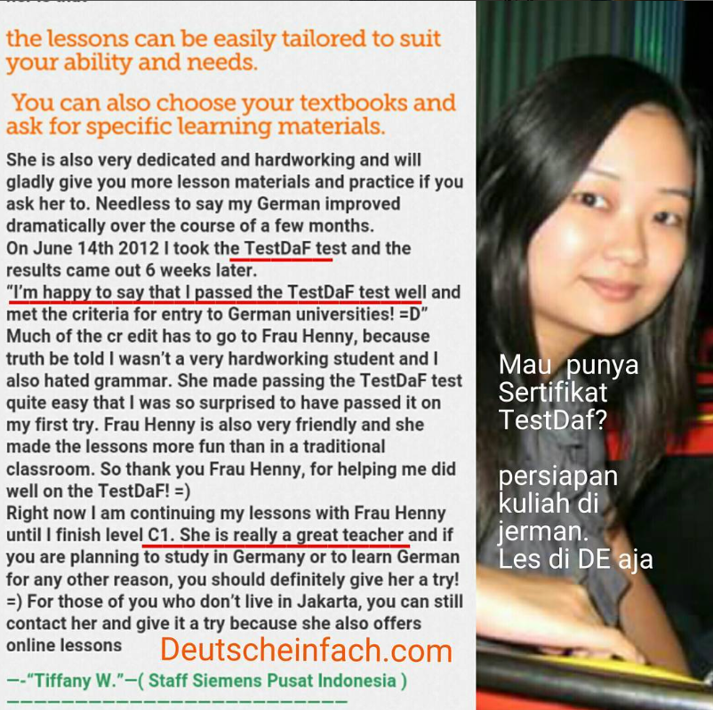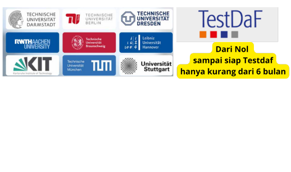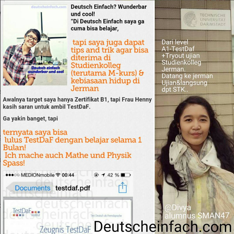 Deutscheinfach mempersiapkan peserta didik dalam menghadapi ujian masuk kampus-kampus negeri unggulan di Negara Jerman yang tergabung di TU9. pembelajaran singkat padat efektif ekonomis dan effisien. pengalaman kami sejak 2011 dan alumni kami berasal dari sma sma unggulan dan sebagian besar telah lulus dan bekerja profesional di jerman. Dari nol sampai Testdaf kurang dari 6 Bulan –> klik *khusus kelas super intensive persiapan kuliah di jerman